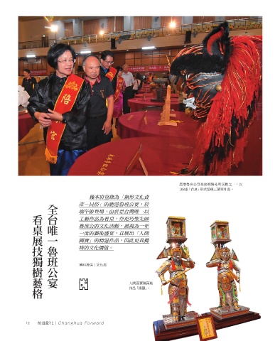 鹿港魯班公宴是慶端陽系列活動之一,以 全台唯一魯班公宴 108桌「看桌」形式呈現工藝家作品。 獲本府登錄為「無形文化資 看桌展技獨樹藝格 產-民俗」的鹿港魯班公宴,於 端午節登場,由於是台灣唯一以 工藝作品為看桌,祭祀巧聖先師 魯班公的文化活動,被視為一年 一度的藝術盛宴,且展出「人間 國寶」的精湛作品,因此更具獨 特的文化價值。 資料提供│文化局 人間國寶陳萬能 作品「錫器」。 લਐজԽᴹ$IBOHIVB 'PSXBSE 1 ۃආ࿎ʷ ኁफʮ JOEE ɨʹ