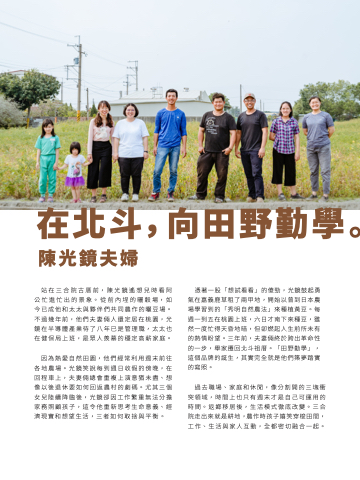 站在三合院古厝前,陳光鏡遙想兒時看阿 公忙進忙出的景象。從前內埕的曬穀場,如 今已成他和太太與夥伴們共同農作的曬豆場。 不過幾年前,他們夫妻倆人還定居在桃園,光 鏡在半導體產業待了八年已是管理職,太太也 在健保局上班,是眾人羨慕的穩定高薪家庭。