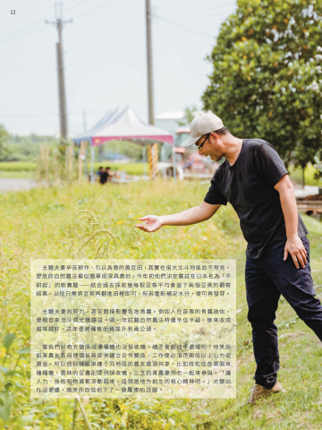 光鏡夫妻的努力,甚至間接影響各地青農。例如人在苗栗的青農政佑, 便親自來北斗向光鏡請益。頭一年試驗自然農法時還半信半疑,後來收成 越來越好,去年便將種植面積提升到兩公頃。