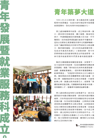 青年築夢大道 今年 3 月 29 日青年節,彰化縣政府勞工處著 眼青年就業權益,在這天宣布增設青年發展暨 就業服務科,對在地青年來說意義非凡。 勞工處為輔導青年就業,成立青就科單一窗 口,提供青年就業諮詢、轉介服務,縣長特別 表示,申請獎勵補助的資格擴大至文創、手作 職業別,目的就是希望能讓文創與手作藝術家, 這些以往較缺乏資源補助的青年也有圓夢機會。 且為了讓創業剛起步的青年們免除巨大租金壓 力,縣府重新盤點、活化利用多處閒置空間, 包括去年啟用的南郭 2、3 號宿舍群,與今年 即將修復完成的鹿港和興派出所宿舍群等,未 來可提供給創業青年們更多基地進駐選擇。