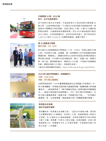 在教育部發表的「108 年臺灣閱讀風貌及全民閱讀力年度報告」中, 彰化縣埔鹽鄉、伸港鄉及線西鄉立圖書館榮獲「整體閱讀力表現績 優城市」,線西鄉更拿下「縣市鄉鎮民眾每人借閱冊數表現績優城 市」,展現文學原鄉的亮眼閱讀力。今年「彰化縣世界閱讀日」在 彰化縣立圖書館舉辦「縱橫半線 - 字謎藏在格子裡」、「好享讀主 題書展」等,以故事導讀、解謎遊戲引領人們體驗閱讀的樂趣!