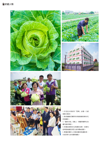 好感人物 01 04 05 02 03 1 外型呈尖球狀的「雪翠」品種,口感 爽脆又鮮甜。 2 縣長攜縣府團隊到埤頭推廣新鮮好吃 的高麗菜。 3 「藝術光點」活動上,曹董聆聽學生為 畫作賞析解說。 4 青農翁順興走在高麗菜田間,自豪地 說埤頭高麗菜深受北部消費者喜愛。 5 曹董認購的上百箱高麗菜陸續裝車, 分送到彰化各地關懷據點。