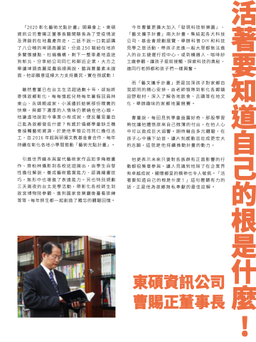東碩資訊公司 曹賜正董事長 今年曹董更擴大加入「發現科技新樂園」、 「藝文攜手計畫」兩大計畫。集結起各大科技 公司、基金會規劃展覽、舉辦科普 DIY 和科技 見學之旅活動,帶孩子走進一般大眾都無法進 入的台北捷運行控中心,或到機器人、咖啡紗 工廠參觀,讓孩子提前接觸、探索科技的奧秘, 連同行老師都和孩子們一樣興奮。
