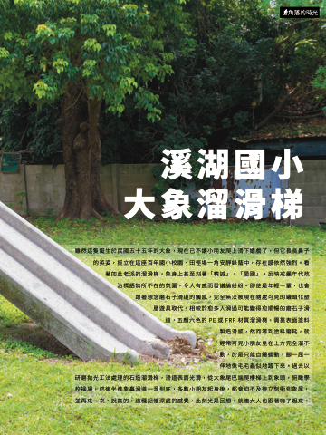 雖然這隻誕生於民國五十五年的大象,現在已不讓小朋友爬上滑下嬉戲了,但它長長鼻子 的英姿,挺立在這座百年國小校園、田徑場一角安靜綠蔭中,存在感依然強烈。看 著如此老派的溜滑梯,象身上甚至刻著「精誠」、「愛國」,反映戒嚴年代政 治標語無所不在的氛圍,令人有感而發議論紛紛。即使是年輕一輩,也會 跟著想念磨石子滑道的觸感,完全無法被現在隨處可見的罐頭化塑 膠遊具取代。相較於愈多人滑過可能變得愈順暢的磨石子滑 道,五顏六色的 PE 或 FRP 材質溜滑梯,需靠表面塗料 製造滑感,然而等到塗料磨耗,就 經常可見小朋友坐在上方完全溜不 動,於是只能自體蠕動,腳一屈一 伸地像毛毛蟲似地蹭下來。過去以 研磨拋光工法處理的石造溜滑梯,滑道表面光滑,從大象尾巴端爬樓梯上到象頭,俯瞰學 校操場,然後坐進象鼻滑道一溜到底,多數小朋友起身後,都會迫不及待立刻衝到象尾, 並再來一次。說真的,這種記憶深處的感覺,此刻光是回想,就連大人也跟著嗨了起來。