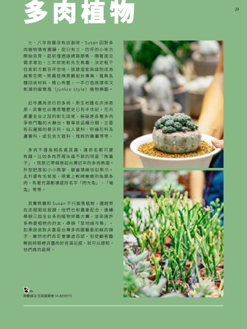 其實熊農和 Susan 不只販售植物,還經常 在店裡開班授課。他們也和農會配合,連續 舉辦三屆全台多肉植物評鑑大賽,並串連許 多熱愛植物的好友,舉辦「草地綠市集」。 如果說這對夫妻是台灣多肉園藝最前線的旗 手,雖然他們肯定會謙虛否認,但從顧客聽 解說時眼裡流露的好奇滿足感,就可以證明, 他們真的是啊。