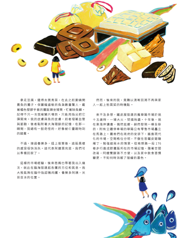 這樣的市場經驗,後來爸媽也帶著我出入幾 次,就此在腦海搭建起各攤的方位和氣息。我 大致能夠在腦中指認豬肉攤,養樂多阿姨,米 苔目冰的位置。