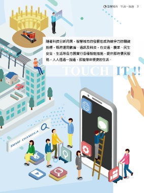 ౽ᅆ̹۬c͛ݺɓܸஷ 3 隨著科技日新月異,智慧城市的發展也成為競爭力的關鍵 指標,縣府運用數據、通訊及科技,在交通、農業、民生 安全、生活等各方面實行各種智能措施,提供即時便民服 務,人人透過一指通,即能帶來便捷的生活。 TOUCH IT !!