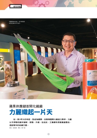 產經旗艦 持續穩健地前進,是力麗董事 長郭紹儀成功的祕訣。 蘋果供應鏈首間化纖廠 力麗織起一片天 從一家2坪大的布莊,到成為蘋果、谷歌等國際大廠協力夥伴,力麗 以不停歇的腳步創新、研發、升級,從成衣、工業織布深度垂直整合, 造就現今的紡織王國。 撰文/張曉琦 攝影/賴一銀 8 ɪʹ 1 ɢᘆ JOEE 1 ɢᘆ JOEE ɪʹ