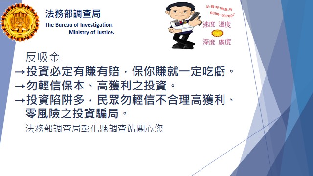 反吸金宣導:1.投資必定有賺有賠,保你賺就一定吃虧。2.勿輕信保本、高獲利之投資。3.投資陷阱多,民眾勿輕信不合理高獲利、零風險之投資騙局