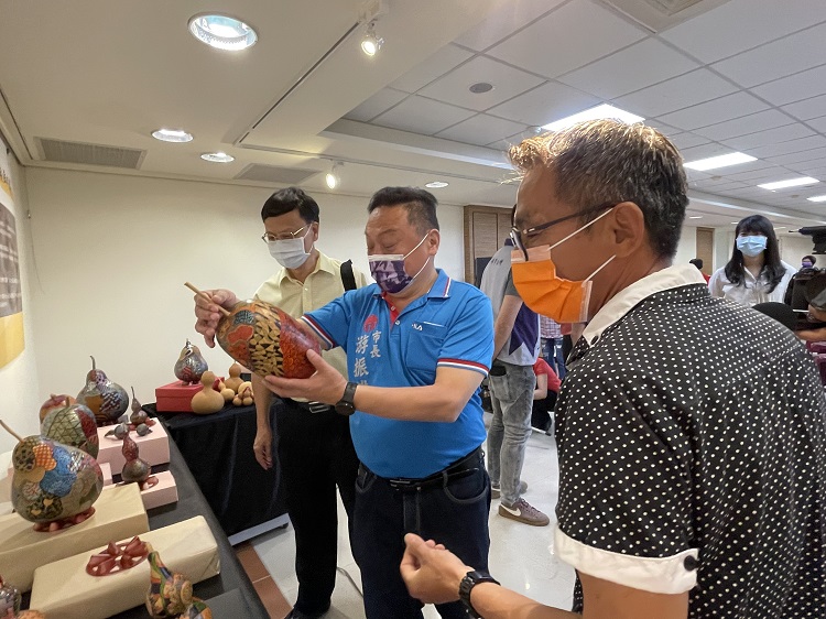 而張申建老師說,雖然本身念的不是藝術相關科系,因熱愛創作,除了文字作品之外,也嘗試彩繪、雕刻等不同的創作方式,於是動手創作彩繪葫蘆或在玻璃杯、酒瓶、面具上雕刻,製作不一樣的「禮物」贈送給朋友。