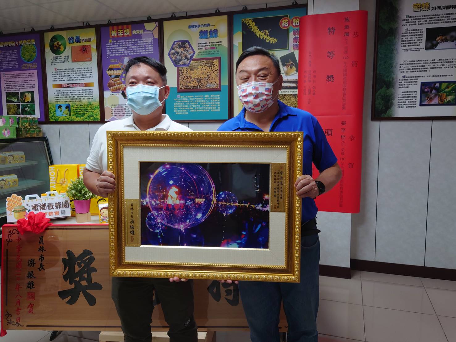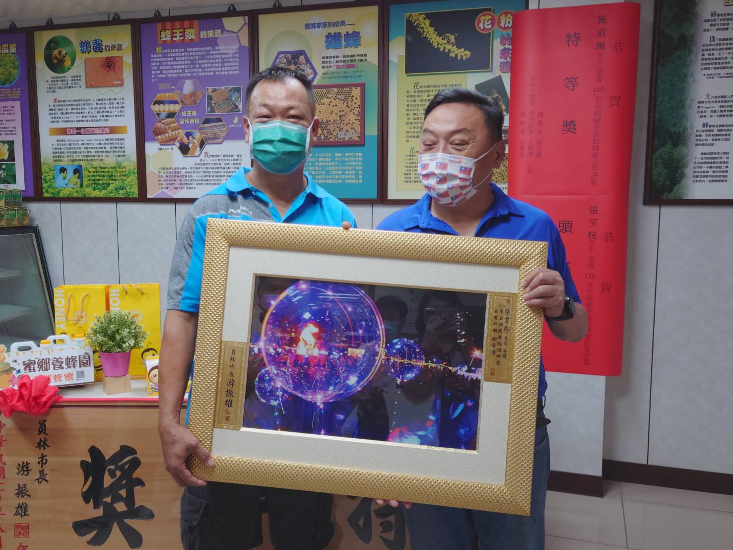 今年全國國產蜂蜜品質評鑑,員林蜂農表現傑出,成績亮眼,龍眼蜂蜜榮獲1面特等獎、4面頭等獎,荔枝蜂蜜榮獲2面頭等獎殊榮。居住於員林市民生里的施淑珮小姐,榮獲蜂蜜品質評鑑最高榮譽-特等獎,同時她的先生張至程亦獲得頭等獎,夫妻檔勘堪稱為農民模範生,巿長游振雄今(5)日上午與員林市農會總幹事黃豐盛共同至蜜鄉養蜂園恭賀所有得獎者。