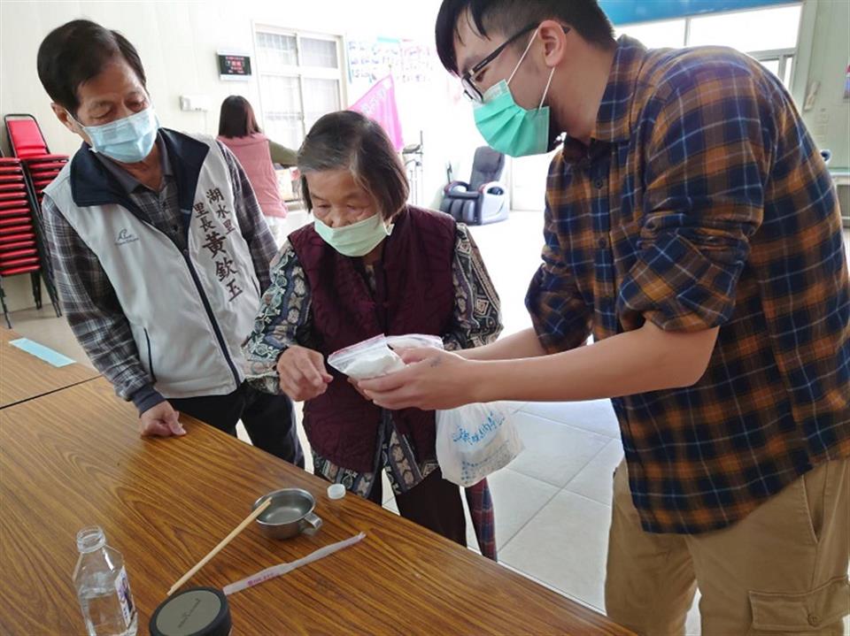 本次宣導會中,教農友配製液態餌劑來誘殺疣胸琉璃蟻,利用市售濃度為20.8%硼酸10公克,加上15公克糖及40公克熱水攪拌溶解之混合液,用塑膠盤子、瓶蓋等不透水容器置於琉璃蟻出沒處,利用螞蟻特殊取食習性,讓工蟻將含毒食物搬回巢中餵食蟻后,連續長期使用就會出現效果,既便宜且治標。但此液態餌劑並不是所有螞蟻都願意「捧場」,例如紅火蟻怕水愛吃油脂味重之洋芋片。