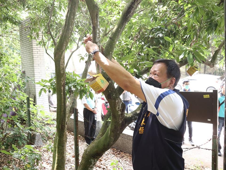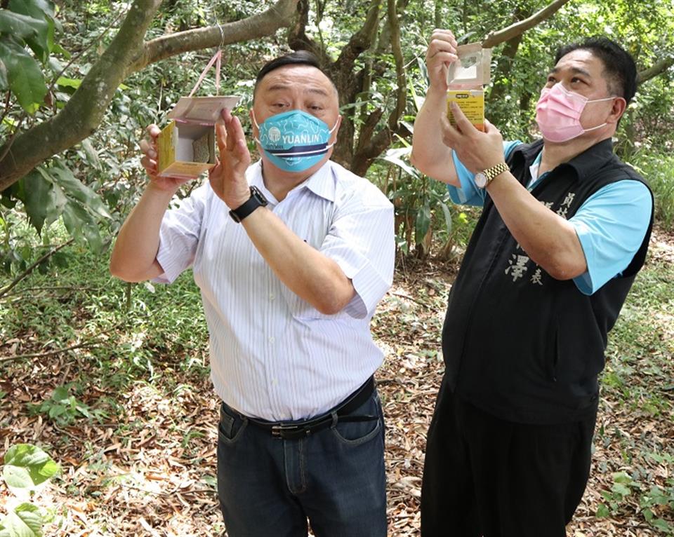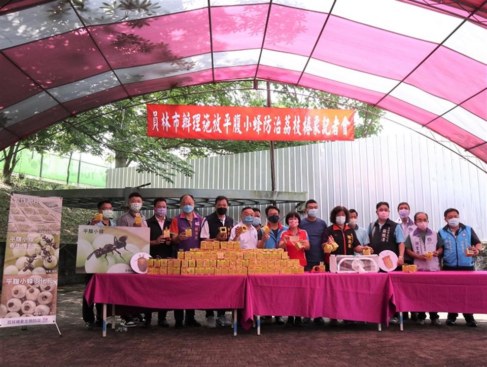 員林市荔枝、龍眼面積約160公頃,市公所為解決廢耕園區荔枝椿象問題,向彰化縣政府爭取32萬隻天敵平腹小蜂施放於廢耕園區進行生物防治,於今(5/10)日上午舉行施放記者會,員林市長游振雄、彰化縣政府農務科長黃松欽、苗栗區農業改良場研究助理李世仰、市民代表會主席賴東位、代表張國良、張徽澤、吳政彥、謝淑敏、張偉傑、縣議員曹嘉豪、劉惠娟、凃俊任與里長謝堂權、江茂達、黃欽玉、邱式麟、蕭富子及員林市農會總幹事黃豐盛等人,齊力將每盒裝有2000粒小蜂卵的防治盒懸掛於萬里長城步道兩側的廢耕龍眼園枝梢上,預計有32萬隻平腹小蜂卵可陸續羽化,雌小蜂會產卵於荔枝椿象卵內,被寄生的卵粒則無法順利孵化出椿象若蟲,從卵內羽化的平腹小蜂又可於田間繼續尋找荔枝椿象的卵寄生,透過平腹小蜂生物防治可友善環境,減少農藥的使用及逐年降低荔枝椿象危害。