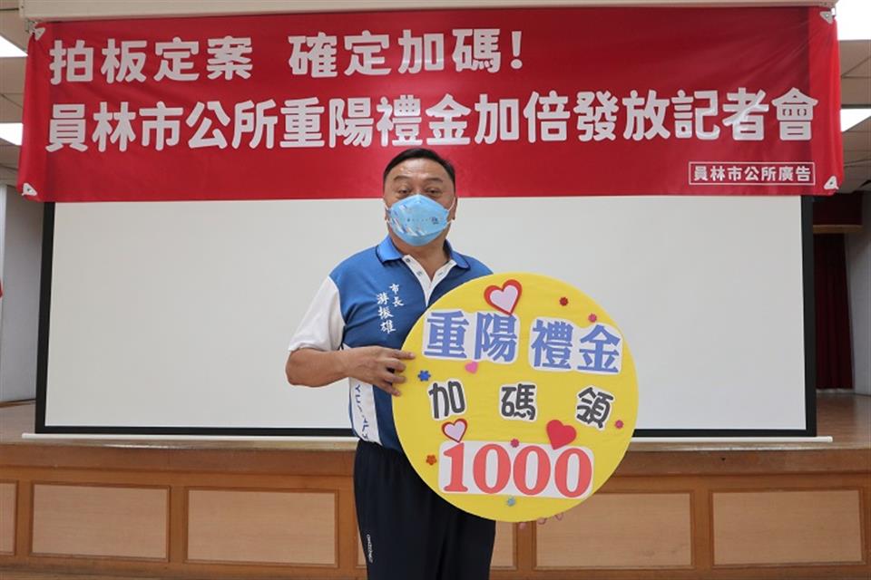 每年九九重陽節,市公所為表達對長者的關懷與重視,編列發放重陽敬老禮金並配合彰化縣政府重陽敬老金採匯款轉帳及現金發放雙軌方式發給,以表達敬老崇老的心意,讓每一位符合資格的長輩都能獲得照顧。今年市公所在衡酌財政狀況向代表會提案將重陽禮金由每位新臺幣500元提高至1000元,獲全體代表大力支持,經大會三讀通過拍板確定,自112年起年滿65歲並於112年1月1日(含)前即設籍本市且至重陽當月前均未遷出員林之長者,將發放加碼重陽禮金1000元。今(11/3)日上午召開記者會對外宣布,由員林市長游振雄主持,員林市民代表會主席賴東位、副主席張國良、各代表與里長聯誼會會長洪光旭及各里里長等皆出席記者會力挺該項政策。