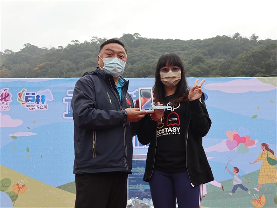 今天健走活動天空雖飄著毛毛細雨但參與民眾不減熱情,一大早在藤山停車場就集結相當多人完成報到手續領取國旗頭巾,緊接著活動一開始由邱燕妮老師帶領貴賓及民眾隨著輕快跳動旋律一起舞動身體暖身,接下來由員林市長游振雄、員林市民代表會主席張國良等貴賓陪同近2000名民眾高唱國歌升旗,隨後在起走線鳴槍後展開以藤山木棧道為起點4公里健走。壓軸登場為現場民眾最引頸期盼的好禮大摸彩-最大獎iphone14由員林市林厝里文小姐獲得,為整場活動帶來最高潮。
