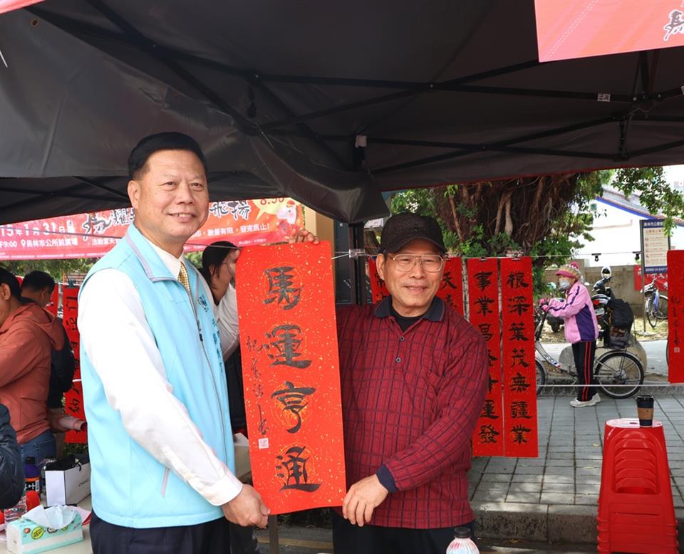 員林市代理市長賴致富表示,每年市公所辦理新春揮毫活動,旨在延續傳統文化,並讓家家戶戶除舊佈新迎新年。今天是員林市公所新春活動的首部曲,二部曲是員林燈會,將於2月14日點燈。相當感謝彰化縣王惠美縣長及代表會對於經費的大力支持,2026年「員林燈會」與「彰化月影燈季」、「花在彰化」並列彰化三大新年活動。員林第三部曲是元宵燈會,將邀請芒果醬等青年樂團共同歡慶。歡迎大家一同來員林賞燈、逛商圈、嘗美食,幸福快樂過新年。
