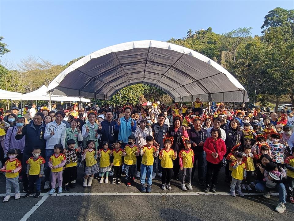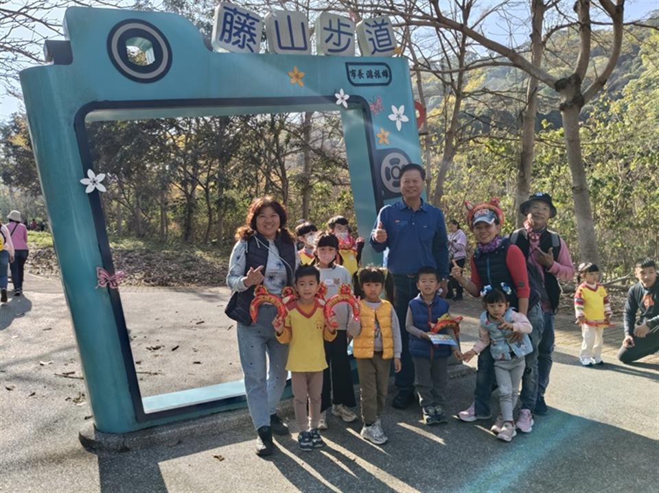 賴致富代理市長又指出,為培養幼兒良好運動習慣並增進親子互動,本次活動特別規劃集章闖關,沿著藤山步道設置多處集章點,包括活動會場2處闖關關卡,以及藤山市集、員獅亭及安徽包子等地標關卡。大家沿著行人木棧道拾級而上,一同欣賞沿途豐富的生態景觀,並透過疊字詞語與閩南語諺語導覽解說,讓孩子在健行過程中認識自然之美與在地文化特色。完成所有關卡並集滿印章後,即可返回會場兌換活動小禮物。透過此次親子踏青活動,不僅讓幼兒親近自然、探索環境,也促進親子間情感交流,留下溫馨難忘的美好回憶。