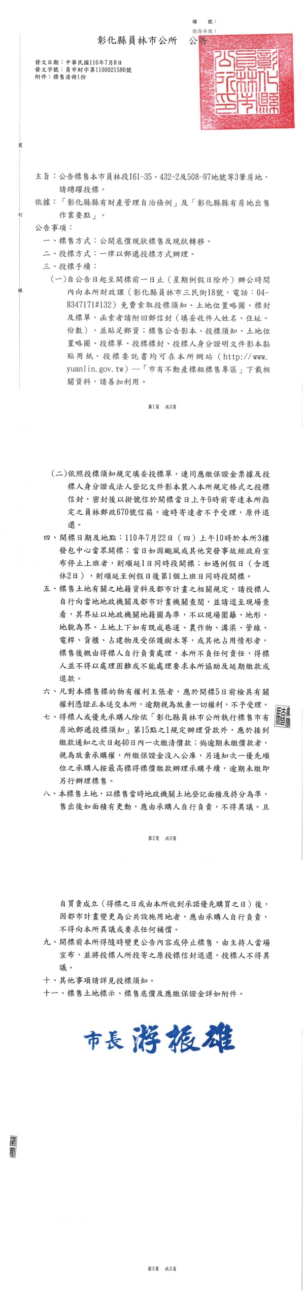 公告標售本市員林段161-35、432-2及508-97地號等3筆房地,開標日期及地點:110年7月22日(四)上午10時於本所3樓發包中心當眾開標。