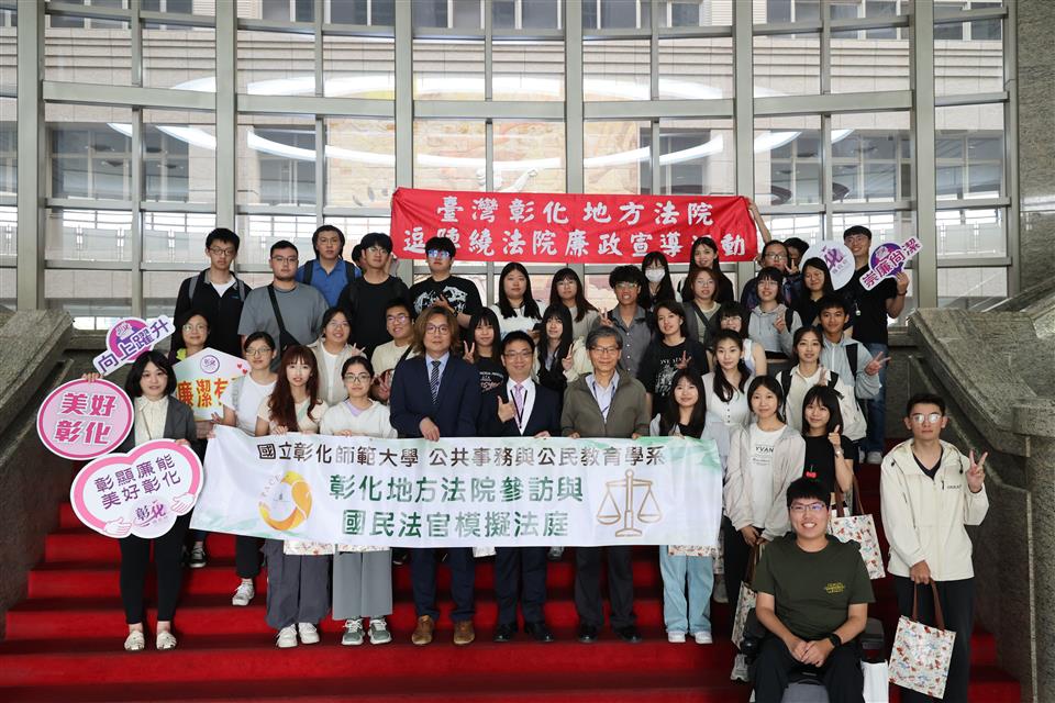 為落實《聯合國反貪腐公約》精神,深化校園誠信教育,並強化青年學子對廉潔法治的正確認知,本處於114年5月2日會同彰化地方法院政風室共同辦理「推動校園誠信專案」。邀請國立彰化師範大學社會科學暨體育學院黃建銘院長,帶領公共事務與公民教育學系33位師生參訪彰化地院,展開一場兼具教育性與實務性的法治體驗之旅。首先由法院同仁以活潑淺顯的方式,介紹地方法院業務運作及司法程序,協助學生正確認識法律諮詢管道,進而釐清民眾對司法公正及司法人員廉潔形象可能產生的誤解或偏見;並由本處簡介公務員廉政法令及進行線上即時有獎徵答活動,強化校園廉潔教育,培養學生誠信守法的價值觀。現場並安排「國民法官模擬法庭」體驗活動,由專責人員透過情境演練與實務分享,提升學員參與度與學習成效,使其深入了解刑事審判流程及其核心原則。活動最後舉辦座談會,與學生進行意見交流,增進對法院便民措施與司法服務理念的了解,充分展現「司法為民、司法親民」的實踐精神。