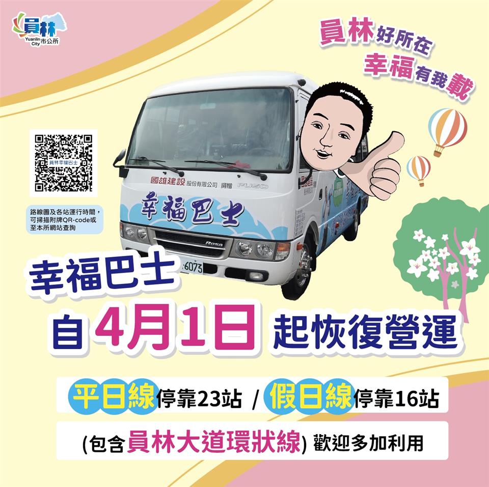 🔔本年度幸福巴士新增員林大道環狀線,自員林市公所(員林公園)站出發,行經員林車站、共融公園、員郭醫院、員林果菜市場、龍燈公園、圓林園生態公園、公二十籃球場、晴雨球場、彰南國民運動中心、員林演藝廳、溝皂社區活動中心,歡迎民眾多加搭乘。