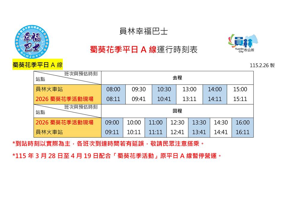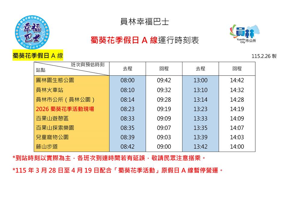 🌺【蜀葵花季限定】3月28日至4月19日運行時刻表
