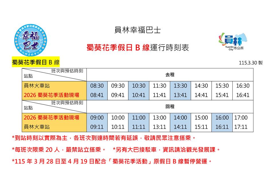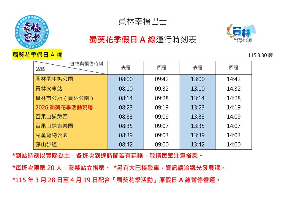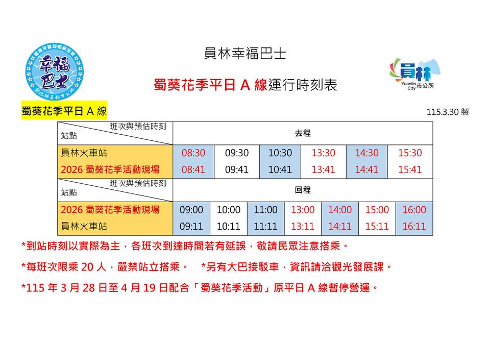 🌺【蜀葵花季限定】4月3日至4月19日運行時刻表