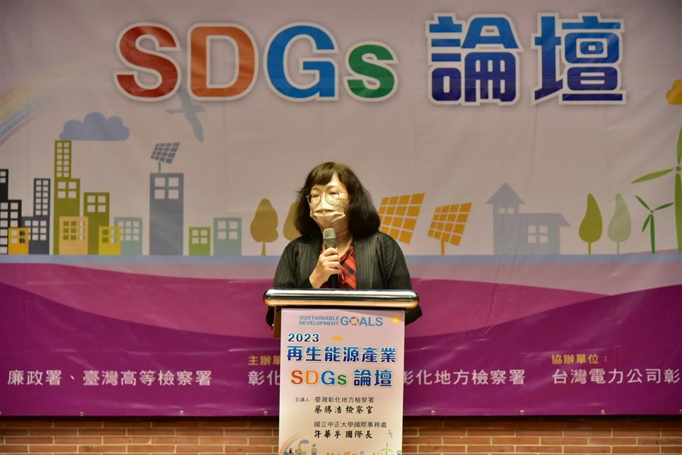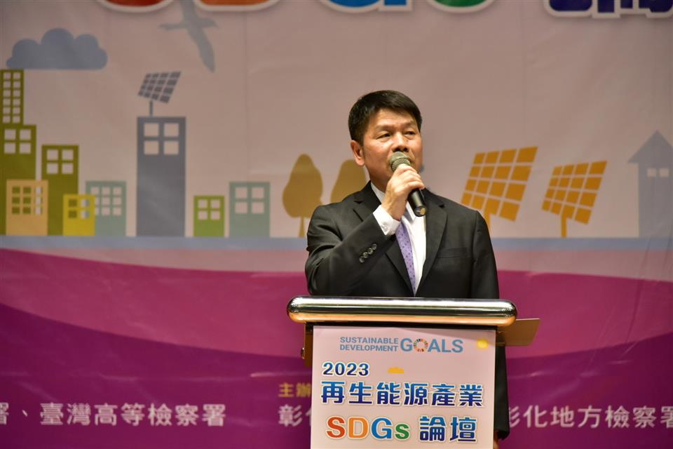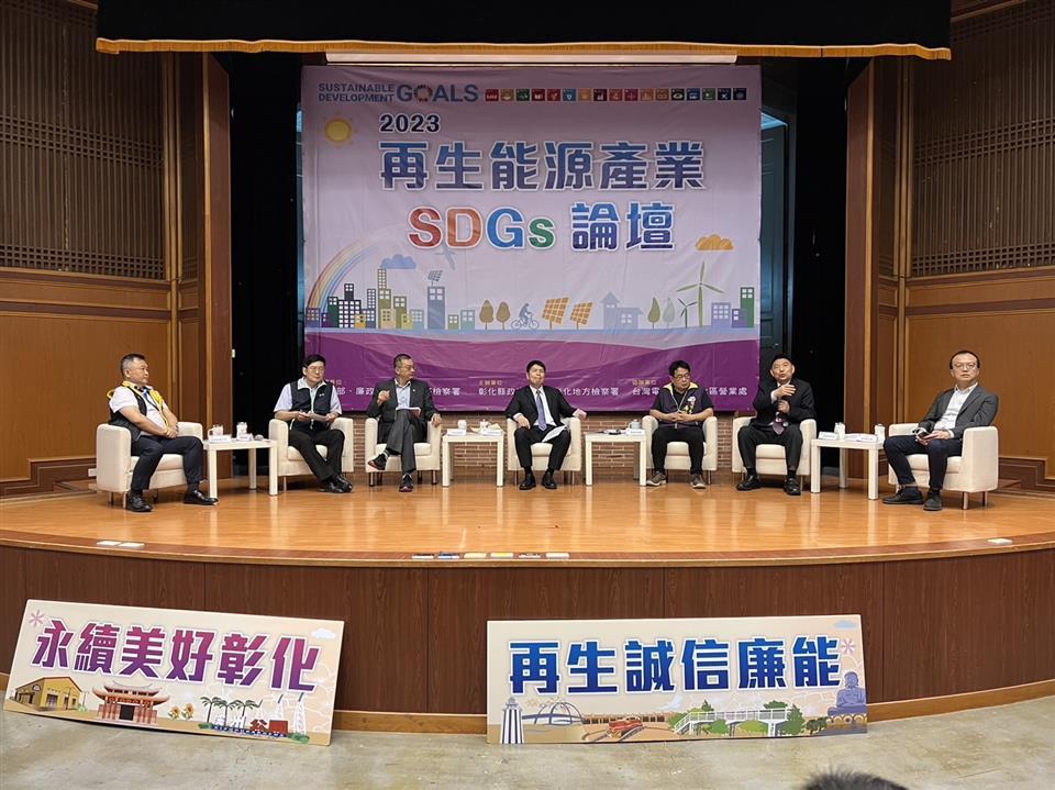 為落實「永續彰化‧循環經濟」的縣政願景及「聯合國反貪腐公約」,實踐「國家廉政建設行動方案」強化企業誠信,凝聚私部門廉潔共識之策略目標,彰化縣政府於112年4月12日在縣立圖書館1樓演講廳舉辦「再生能源產業SDGs論壇」,由縣府秘書長陳逸玲主持,並邀請彰化地檢署檢察長洪家原、廉政署副署長沈鳳樑、高檢署台中分署主任檢察官張宏謀、法務部主任檢察官林彥均、法務部調查局彰化縣調查站主任徐國楨、海巡署偵防分署彰化查緝隊隊長趙吉田、台電公司、中華民國太陽光電發電系統同業公會事務長彭正宗等貴賓出席,參與人員包括再生能源企業20餘家,縣府、公所、學校及台灣電力公司等承辦人員等約160人共同與會。