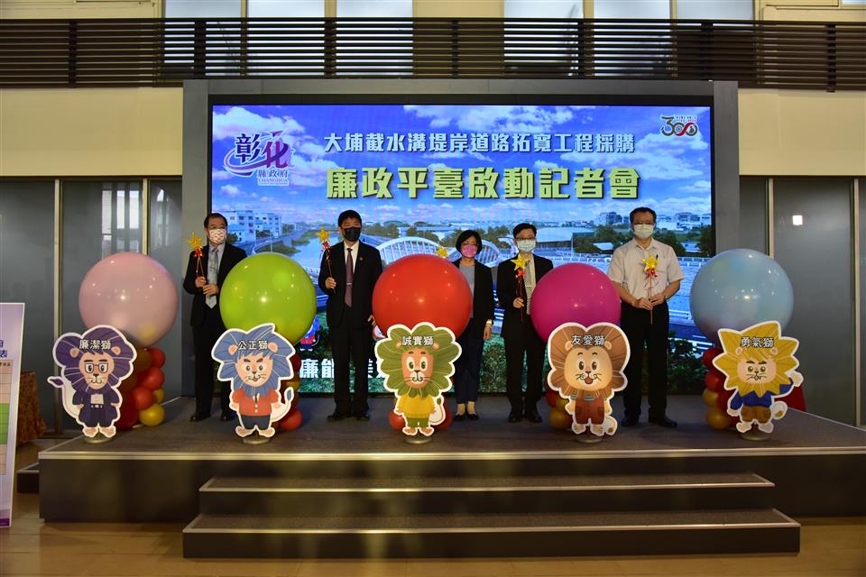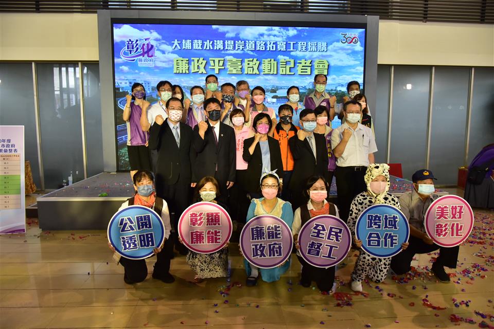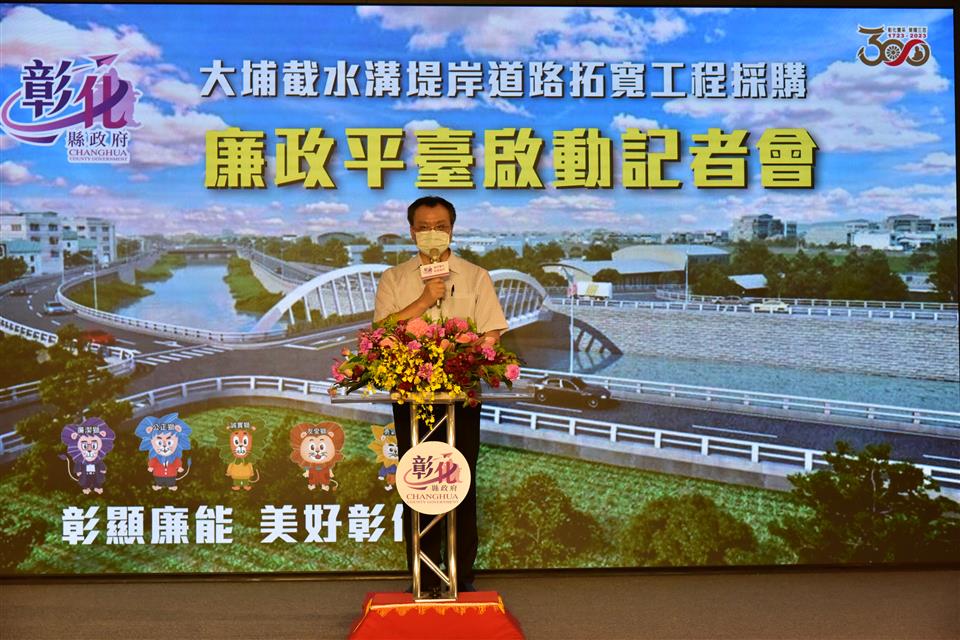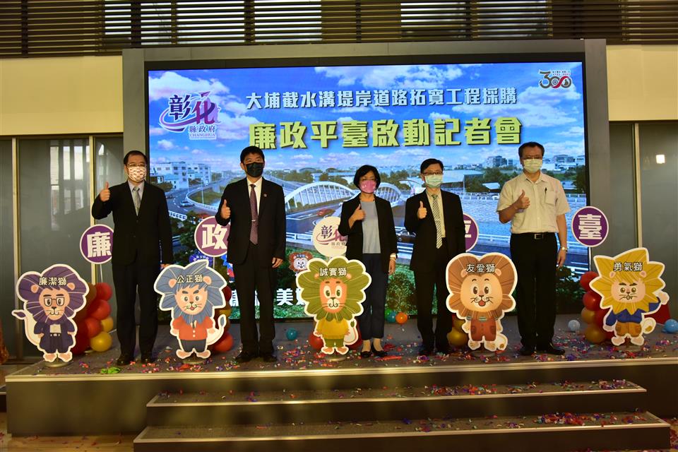 「大埔截水溝堤岸道路拓寬工程」為彰化縣重大工程建設,為提升重大公共工程品質,創造優質的採購環境,彰化縣政府11日上午由縣長王惠美、法務部廉政署署長莊榮松、勞動部職業安全衛生署署長鄒子廉、彰化地檢署檢察長洪家原及法務部調查局彰化縣調查站主任于國慶等人,於縣府中庭共同啟動彰化縣第一個重大工程採購廉政平臺,「大埔截水溝堤岸道路拓寬工程採購廉政平臺」,宣示從設計、發包施工到驗收之生命週期,均公開透明,接受全民監督,並透過檢、調、廉及職安協力把關,共創無垢、如質安全的工程採購品質,將可消除外界因不清楚政府採購流程所造成之疑慮,並且彰顯縣府團隊廉能施政效率。