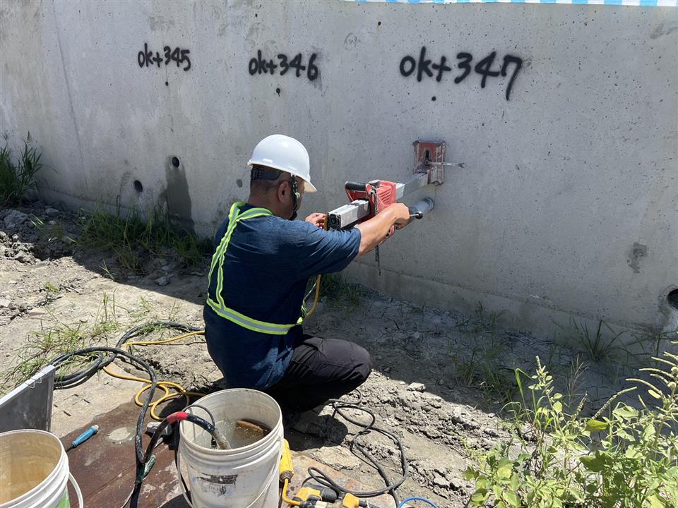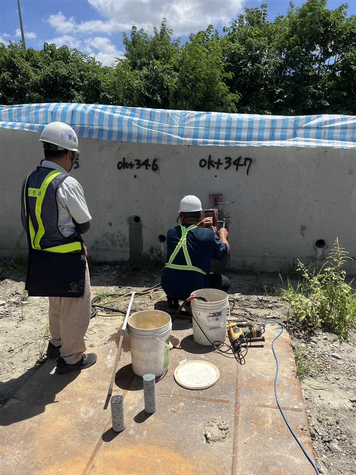 抽驗結果:第一工區右側擋土牆第一昇層RC(0k+345)、(0k+346)、(0k+347)抗壓強度(平均強度)與合約規範相符。
