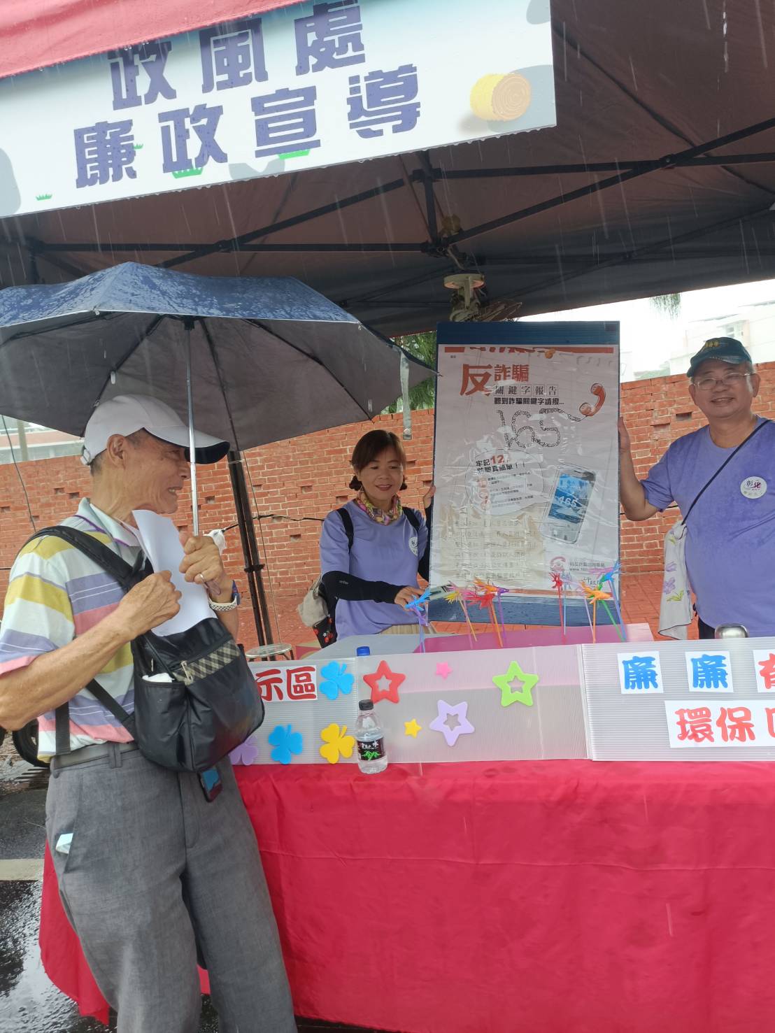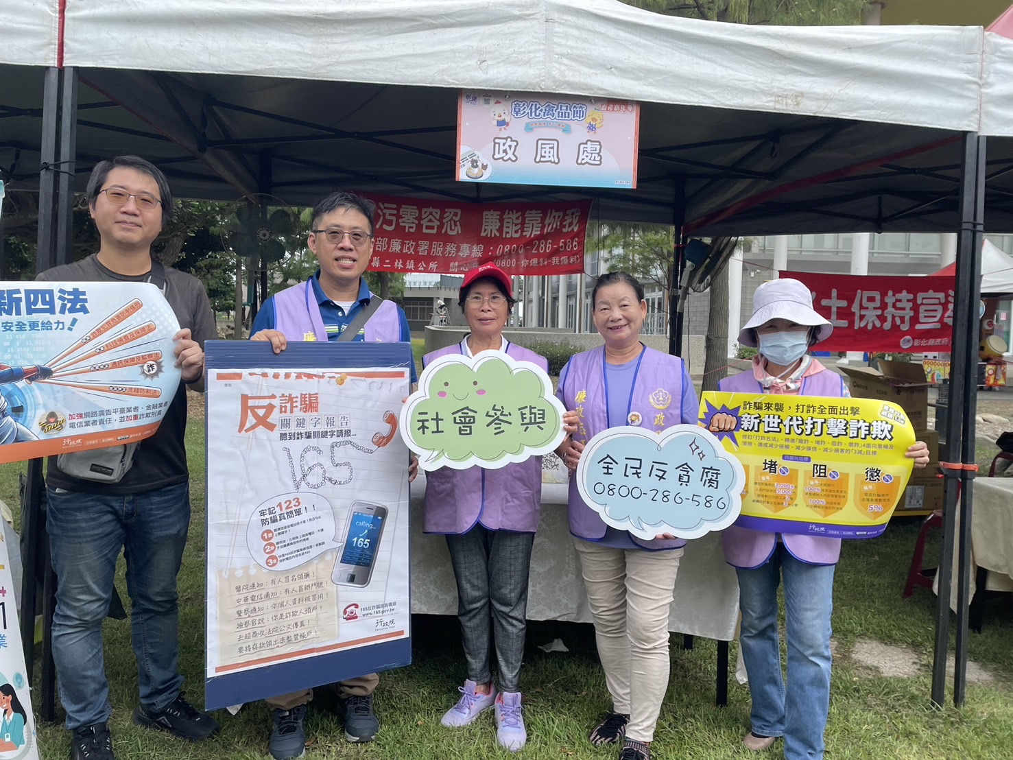 本處結合彰化縣政府於113年9月間辦理「2024彰化畜產嘉年華-智慧畜產.彰化優鮮」系列活動,每週以不同雞、鴨、羊、豬、牛為活動主題,推廣彰化在地優質畜禽產品,於9月8日在二林鎮之彰化禽品節、9月15日在溪湖鎮之彰化羊肉節、9月21日及22日在福興鄉之乳牛節共計4場次活動,擺設廉政宣導攤位,以趣味活潑寓教於樂之方式宣導廉政法令及反詐騙觀念,由12名廉政志工協助進行有獎徵答遊戲及環保DIY與民眾互動,並發放廉政宣導品,讓廉政暨反詐騙資訊深刻烙印民眾心中。